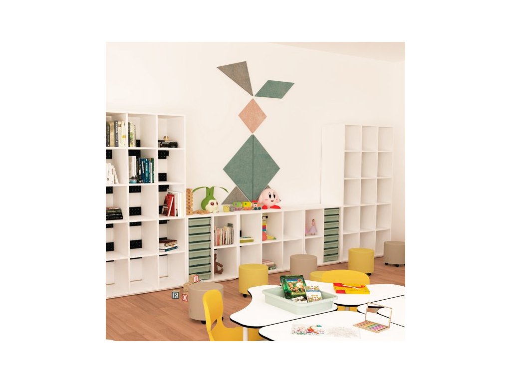 Tyto akustické panely byly inspirovány oblíbeným čínským puzzle Tangram a při jejich navržení byl kladen důraz na hravé a kreativní využití. Kromě pěkného interiérové prvku přinesou do místnosti také výrazné vylepšení akustiky, absorbují nežádoucí hluk a umožní tišší, více příjemnou atmosféru. Panely jsou vyrobeny za recyklovaných PET lahví, proto představují také ekologickou a udržitelnou variantu akustických prvků do interiéru.