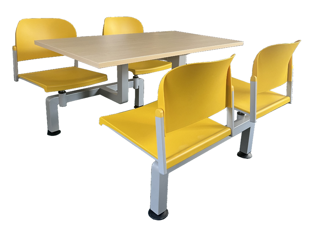 Jídelní set s kovovou konstrukcí a sedákem na pevném nebo otočném mechanismu.